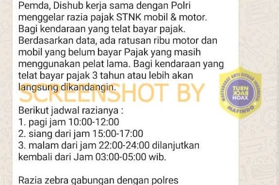 Tersebar pesan berantai media pesan WhatsApp bahwa akan diadakan razia Surat Tanda Nomor Kendaraan (STNK) mobil dan sepeda motor di seluruh Indonesia. Isi pesan itu menyebutkan, razia akan dilakukan pada Rabu, 30 Desember 2020 pada pukul 10.00-12.00, 15.00-17.00, 22.00-24.00, dan dini hari pukul 03.00-05.00.