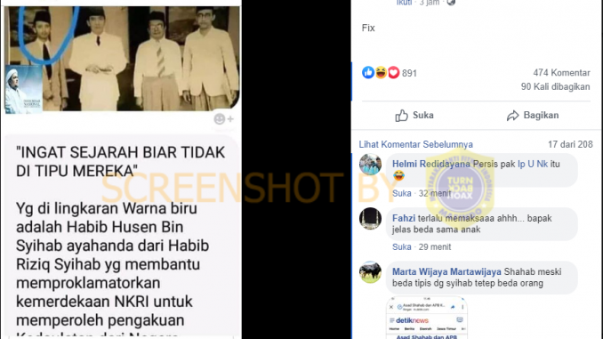 Akun facebook bernama Deni Indra Koto megunggah gambar dari postingan gambar yang di dalamnya terdapat narasi dari sebuah grup facebook. Dalam foto tersebut diklaim bahwa orang yang dilingkari berwarna biru dan berdiri disamping Presiden pertama Indonesia, Soekarno adalah Habib Husen Bin Syihab, Ayahanda Habib Riziq Shihab yang membantu memplokamatoran kemerdekaan NKRI.