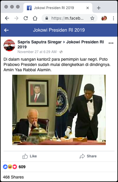“Di dalam ruangan kantor2 para pemimpin luar negri. Poto Prabowo Presiden sudah mulai dilengketkan di dindingnya. Amiin Yaa Rabbal Alamiin.”