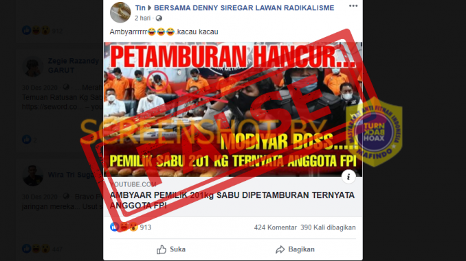 Faktanya, tidak ada kaitannya dengan FPI. kaitannya dengan FPI. Polda Metro Jaya membantah bahwa pengungkapan kasus 201 kg di Petamburan ada kaitannya dengan FPI. Narasi di video itu juga tidak menyebutkan bahwa pemilik sabu 201 kg itu adalah anggota FPI.