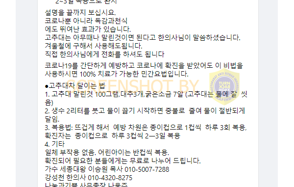 Akun facebook bernama 김남혁 (Namhyuk Kim) mengunggah status berisi informasi terkait ramuan dari Korea Selatan yang diklaim meminum rebusan daun teh dengan batang lada dapat menyembuhkan covid19 dalam kurun waktu 2 sampai 3 hari.