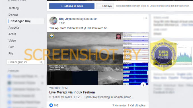 Akun Rmj Jaya (fb.com/wahyujaya01) pada 2 Januari 2021 membagikan tautan video Youtube berjudul “Live Merapi via Induk Frekom” yang diunggah di kanal Induk Frekom_86 ke grup Info Merapi dengan narasi sebagai berikut: