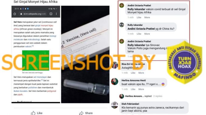 Pengguna Facebook Andini Octavia Pertiwi mengunggah informasi (29/11) yang menyatakan bahwa vaksin Sinovac mengandung Vero Cell atau sel kera hijau Afrika. Dalam pesan tersebut juga disertakan foto kemasan vaksin Sinovac serta foto hasil tangkapan layar definisi Sel Vero menurut situs Wikipedia.
