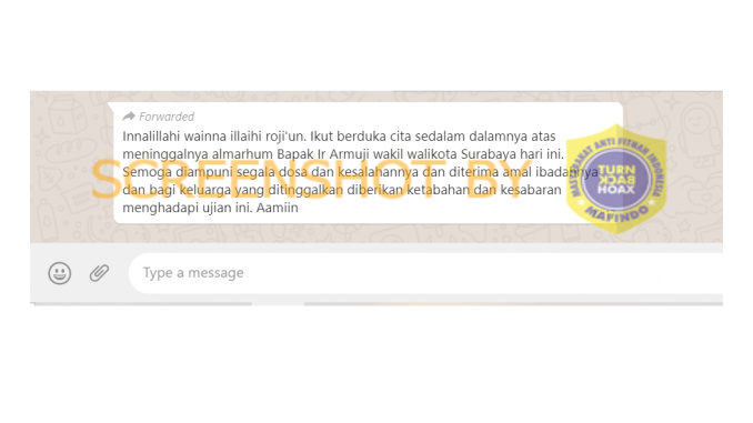 Melalui pesan berantai Whatsapp, beredar informasi yang menyebut bahwa Wakil Wali Kota Surabaya terpilih Armuji meninggal dunia. Berdasar pada referensi, disebutkan bahwa informasi terkait meninggalnya Armuji telah beredar sejak pagi hari, tepatnya pada Selasa 5 Januari 2021.