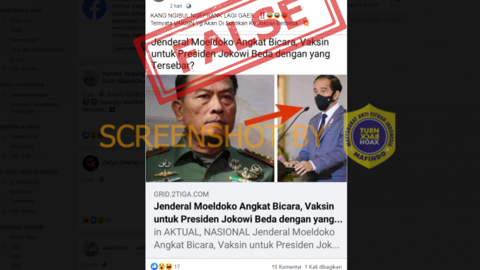 Pada gambar yang ia unggah, terdapa narasi “Jenderal Moeldoko Angkat Bicara, Vaksin untuk Presiden Jokowi Beda dengan yang Tersebar?” dan tangkapan layar artikel berjudul “Jenderal Moeldoko Angkat Bicara, Vaksin untuk Presiden Jokowi Beda dengan yang Tersebar?”