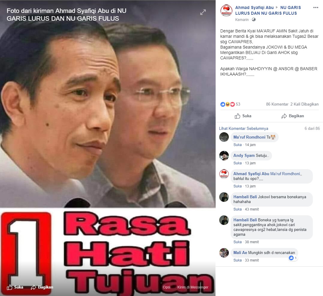 Informasi yang menyatakan bahwa Calon Wakil Presiden (Cawapres) Nomor Urut 01 Ma’ruf Amin sakit karena terjatuh di kamar mandi dan tidak bisa menjalankan kewajibannya sebagai Cawapres merupakan info yang tak benar. Dilansir dari detik.com, cnnindonesia.com, sindonews.com, dan kompas.com, Ma’ruf Amin menegaskan bahwa dirinya tidak mengalami sakit yang parah dan hanya mengalami kaki terkilir saat beraktivitas. “Saya sebenarnya bukan sakit, tak ada, saya tak sakit, dalam arti cuma kaki terkilir, jangankan orang tua, muda pun bisa mengalami hal demikian,” ujarnya.