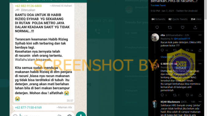 Akun Twitter @masbudi11 (@masbudi111) mengunggah foto hasil tangkapan layar berupa pesan WhatsApp yang berisi percakapan bahwa Rizieq Shihab sedang sakit yang tidak normal karena telah diracuni di dalam tahanan Polda Metro Jaya. Unggahan tersebut mendapatkan atensi sebanyak 305 balasan, 354 suka, dan 166 retweet.