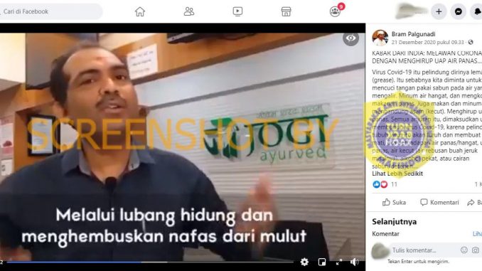 Akun Facebook Bram Palgunadi mengunggah video pada Senin (21/12/2020). Dalam video tersebut terdepat seorang laki-laki yang bernama Nilesh Jogal yang menyebutkan bahwa dengan menghirup uap air panas sebanyak dua kali sehari melalui hidung dan dihembuskan melalui mulut diyakini mampu menangkal virus Covid-19. Video tersebut pertama kali tayang di akun Youtube JOGI Ayurved pada 10 Desember 2020.