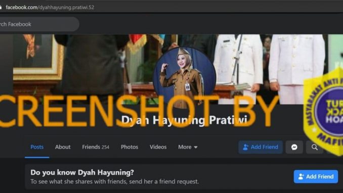 Beredar akun Facebook Bupati Purbalingga, Dyah Hayuning Pratiwi, dengan nama pengguna ‘Dyah Hayuning Pratiwi’ ( https://www.facebook.com/dyahhayuning.pratiwi.52 ). Akun tersebut melakukan komunikasi melalui fitur Messenger kepada beberapa orang serta meminta untuk dikirimi uang dan pulsa.