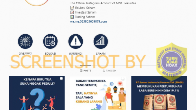 Beredar akun palsu di Instagram dengan nama pengguna (@mnc_sekuriitas). Akun tersebut menawarkan jasa keuangan dengan menyisipkan tautan chat Whatsapp sebagai media pelayanannya.