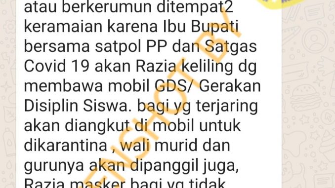 Beredar pesan berantai di media sosial yang berisi informasi bahwa akan ada razia keliling yang dilakukan Bupati bersama dengan Satpol PP dan Satgas Covid-19 menggunakan mobil GDS/Gerakan Disiplin Siswa. Bagi anak yang kedapatan melanggar akan diangkut dan dikarantina.
