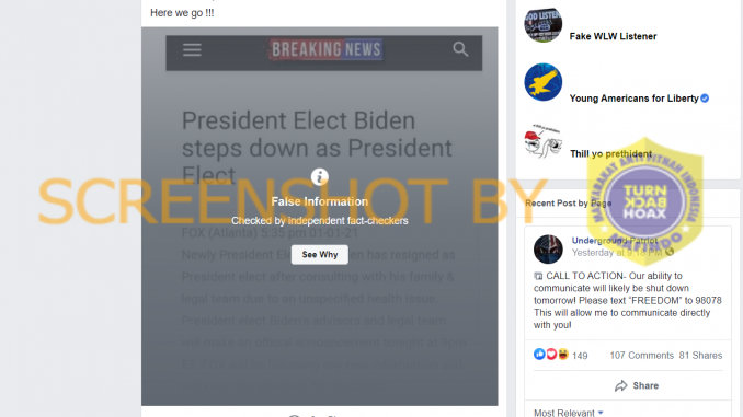 Akun Facebook Underground Patriot mengunggah foto hasil tangkapan layar yang di dalamnya terdapat informasi bahwa presiden AS terpilih, Joe Biden, mengundurkan diri dari jabatannya karena masalah kesehatan yang tidak ditentukan. Unggahan tersebut telah mendapat atensi sebanyak 1,1 ribu reaksi, 2 ribu komentar, dan dibagikan sebanyak 1,5 ribu kali.
