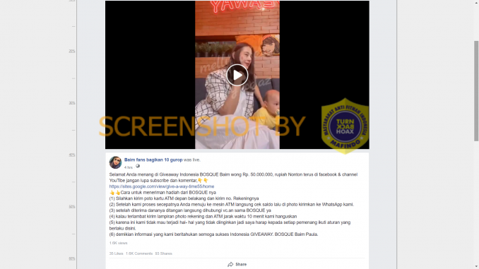 Unggahan terkait bagi-bagi hadiah dari Baim Wong juga pernah dibahas dalam artikel Turn Back Hoax yang berjudul “[SALAH] Baim Wong Adakan Giveaway Di Grup Facebook” pada 24 Oktober 2020.