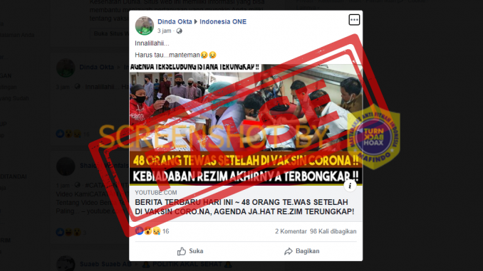 AKun Dinda Okta (fb.com/dinda.okta.39982) pada 16 Janauri 2021 membagikan tautan video Youtube berjudul “BERITA TERBARU HARI INI ~ 48 ORANG TE.WAS SETELAH DI VAKSIN CORO.NA, AGENDA JA.HAT RE.ZIM TERUNGKAP!” ke grup Indonesia ONE dengan narasi sebagai berikut: