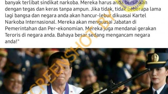 Beredar di media sosial Facebook, sebuah narasi berisi peringatan Presiden Filipina Rodrigo Duterte kepada Presiden Joko Widodo terkait ancaman kartel narkoba internasional. Akun Facebook Putera Bhineka ini mengklaim bahwa Duterte menyayangkan pemerintah Indonesia yang kehilangan gembong narkoba besar Labuhanbatu. Dalam narasi juga ditambahkan, bahwa kartel narkoba tersebut mendanai aksi terorisme di Indonesia dan akan menguasai pemerintahan dan perekonomian di Indonesia.
