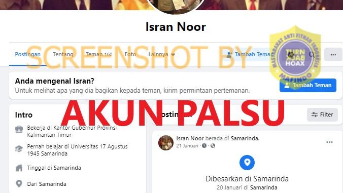 Beredar akun Facebook Gubernur Kalimantan Timur Isran Noor, dengan nama pengguna “Isran Noor”. Akun tersebut menggunakan foto profil, Gubernur Isran Noor saat melakukan salam komando bersama Menteri Pertahanan RI yang juga Ketua Umum Partai Gerindra, Prabowo Subianto dengan latar gambar Jenderal Besar Soedirman, serta memiliki pertemanan sebanyak 160.