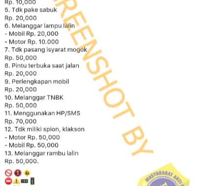 Telah beredar di media sosial khususnya Facebook sebuah broadcast berisi biaya tilang terbaru di Indonesia.