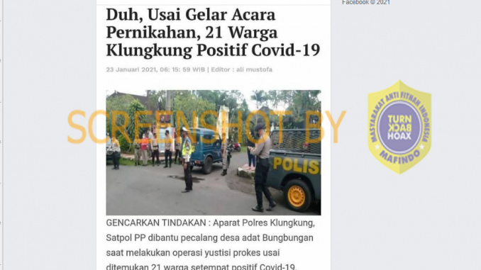 Akun Facebook Bii mengunggah gambar hasil tangkapan layar artikel radarbali.jawapos.com berjudul “Duh, Usai Gelar Acara Pernikahan, 21 Warga Klungkung Positif Covid-19” disertai dengan narasi yang mengklaim banyak yang positif Covid-19 bukan karena acara pernikahan melainkan tes rapid, swab, dan lainnya menjadi penyebab utama banyaknya angka positif Covid-19.