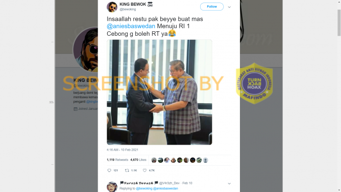Akun Twitter @bewoking mengunggah foto disertai dengan narasi yang menggambarkan bahwa dalam foto tersebut, Susilo Bambang Yudhoyono memberikan restu kepada Anies Baswedan untuk maju menuju RI 1. Unggahan tersebut mendapatkan atensi sebanyak 1.119 retweet, 4.670 like, dan 121 balasan.