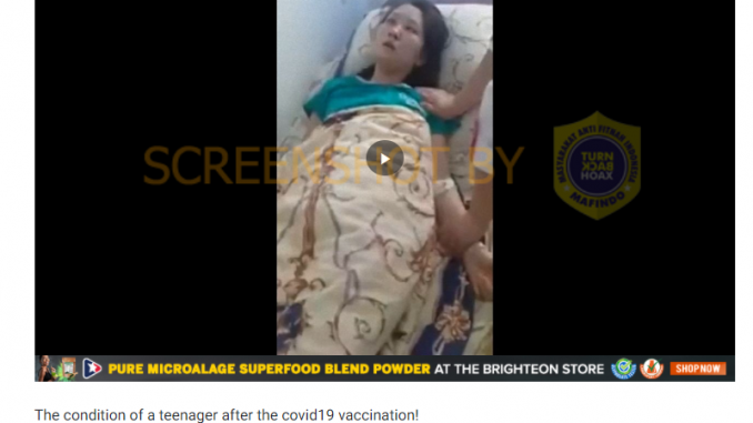 Sebuah akun bernama TruthAndFreedom1 mengunggah video di situs brighteon.com dengan klaim bahwa seorang remaja perempuan mengalami efek samping berupa kejang setelah mendapatkan vaksinasi covid-19. Video berdurasi 1.46 menit tersebut telah ditonton sebanyak 69.150 kali.