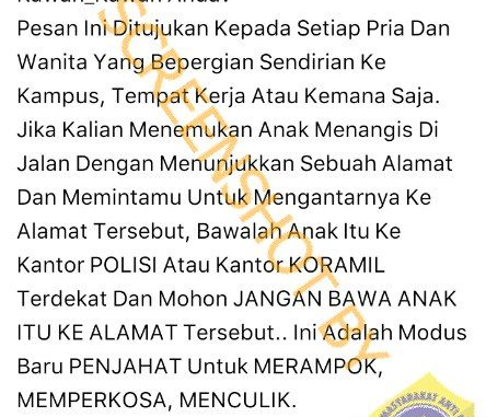 Telah beredar sebuah broadcast di media sosial yang mencatut nama Humas Mabes & Polri, informasi tersebut berisi modus baru kejahatan baik berupa perampokan, pemerkosaan maupun penculikan.