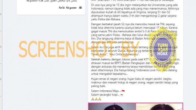 “Meskipun partisipasi #Audrey di NASA dan tawaran pekerjaan di BPPT itu hoax, tetapi kejeniusannya merupakan sebuah kebenaran. #Audrey yang bernama lengkap Audrey Yu Jia Hui ini merupakan perempuan keturunan Tionghoa yang