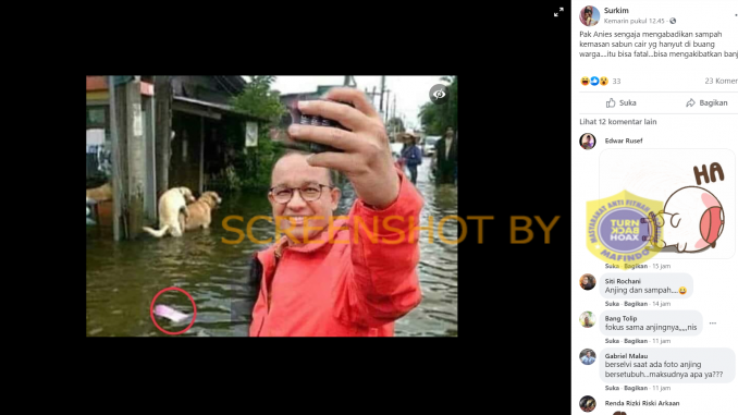 Akun Facebook Surkim mengunggah foto Anies Baswedan sedang berswafoto di lokasi banjir dengan disertai narasi. Unggahan tersebut telah mendapat atensi sebanyak 15 reaksi dan 12 komentar.