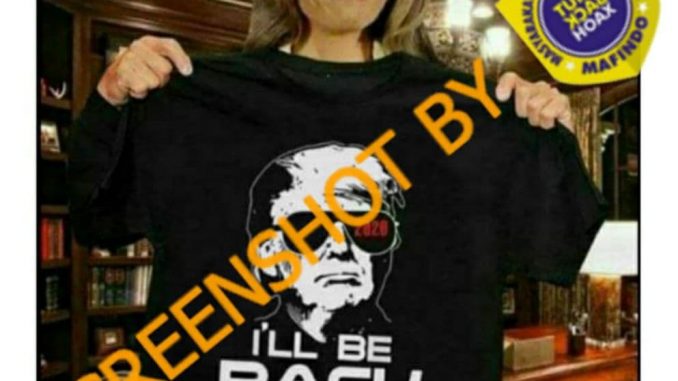 Pengguna Twitter dengan nama pengguna patriottakes mengunggah sebuah foto (9/2) yang menunjukkan Melania Trump memegang sebuah kaos bergambar wajah Donald Trump. Dalam kaos tersebut juga tercantum tulisan “I’LL BE BACK” atau “Aku akan Kembali”.