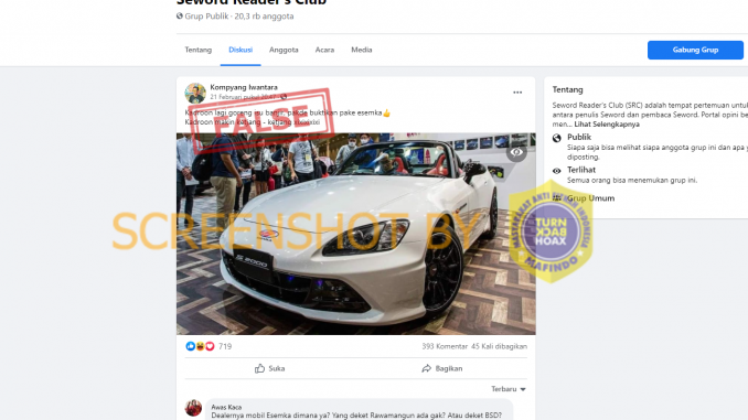 Akun Facebook Kompyang Iwantara (fb.com/kompyang.iiewandthara) pada 21 Februari 2021 mengunggah sebuah foto mobil jenis sedan berwarna putih yang tengah berada di lokasi pameran yang terdapat logo Esemka di bagian depan mobil tersebut ke grup Seword Reader’s Club dengan narasi sebagai berikut: