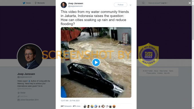Akun Twitter Joep Janssen (@joepjanssencom) mengunggah video hanyutnya sebuah mobil yang terbawa arus banjir dengan klaim bahwa video tersebut didapatkannya dari teman rekan komunitasnya di Jakarta. Unggahan tersebut mendapatkan atensi sebanyak 247 retweet, 471 like, dan 78 balasan.