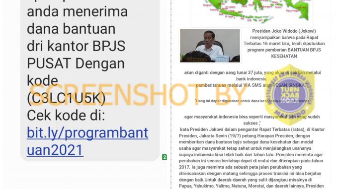“PEMBERITAHUAN kpd bpk/ibu anda menerima dana bantuan dri kantor BPJS PUSAT Dengan kode (C3LC1U5K) Cek kode di: bit. ly/programbantuan2021.”