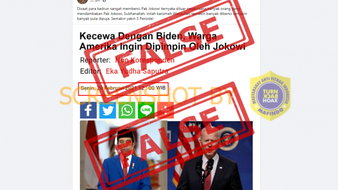 Akun Facebook Dukung Jokowi 3 Periode (fb.com/Jokowi3Period) pada 28 Februari 2021 mengunggah sebuah gambar tangkapan layar artikel berjudul “Kecewa Dengan Biden, Warga Amerika Ingin Dipimpin Oleh Jokowi” dengan narasi sebagai berikut: