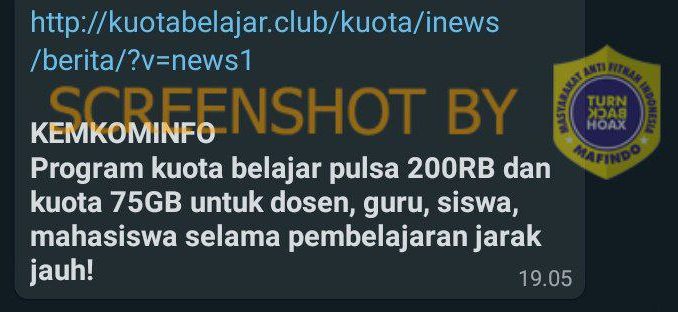 Beredar di Whatsapp link program kuota belajar berupa pulsa sebesar 200 ribu dan kuota sebesar 75GB. Kuota tersebut diperuntukkan kepada dosen, guru, siswa, mahasiswa selama pelajaran jarak jauh. Dalam tautan link tersebut mencatut beberapa akun Kemendikbud.