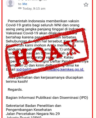 Telah beredar surat elektronik (surel) yang mengatasnamakan Bagian Informasi, Publikasi, dan Diseminasi (IPD) Sekretariat Badan Litbang Kesehatan terkait pendaftaran untuk pemberian vaksin Covid-19 untuk seluruh WNI dan WNA yang jangka panjang tinggal di Indonesia.