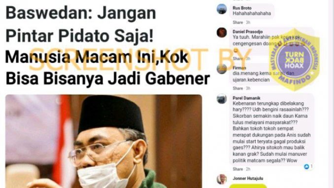 Beredar postingan gambar Wakil Ketua MPR Jazilul Fawaid disertai narasi “Gus Jazil ke Anies Baswedan: Jangan Pintar Pidato Saja! Manusia Macam Ini,Kok Bisa Bisanya Jadi Gabener”. Postingan tersebut diunggah akun Facebook bernama Ferry Ansyah.