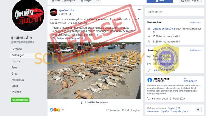 Akun Facebook ผู้หญิงคันปาก (fb.com/pomgossipgirl.s) pada 2 Maret 2021 mengunggah foto bangkai anjing di pinggir jalan dengan narasi sebagai berikut:
