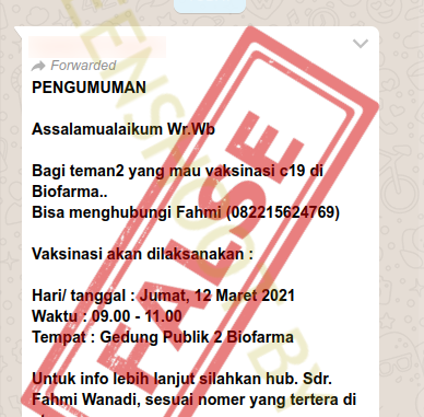 Telah beredar pesan berantai di Whatsapp tentang ajakan vaksinasi Covid-19 pada Jumat (12/3/2021) di Bio Farma. Dalam pesan tersebut disebutkan vaksinasi akan dimulai pada pukul 09.00 hingga 11.00 di Gedung Publik 2 Biofarma, selain itu tercantum juga nomor telepon atas nama Fahmi untuk mendapatkan info lebih lanjut.