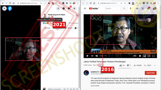 KOMPAS.com: “Kejaksaan Agung menyatakan video yang beredar di media sosial terkait penangkapan seorang Jaksa oleh Tim Saber Pungli Kejaksaan Agung tidak terkait dengan persidangan kasus mantan pimpinan Front Pembela Islam (FPI) Rizieq Shihab. Kepala Pusat Penerangan Hukum Kejagung Leonard Eben Ezer Simanjuntak mengatakan video tersebut merupakan rekaman peristiwa yang terjadi pada 2016.”