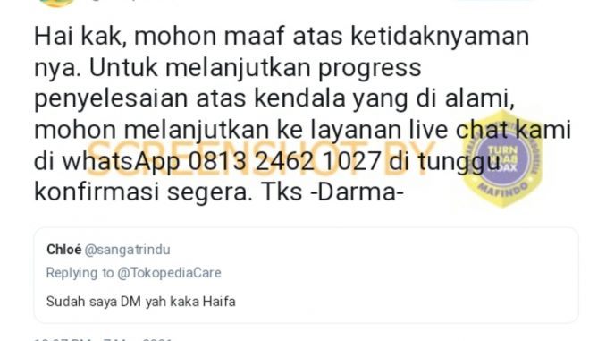 Beredar akun Twitter Tokopedia @TokopediaCere yang membalas beberapa keluhan beberapa pengguna Twitter dan mencantumkan link yang mengarahkan percakapan melalui Whatsapp.