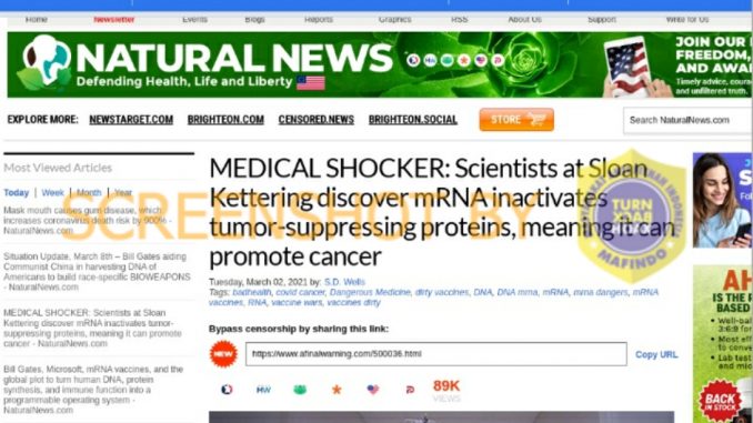 Sebuah artikel dari media Natural News, mengunggah hasil penelitian terkait mRna. Artikel ini menjelaskan bahwa vaksin berbasis mRna yang saat ini tengah dikembangkan, dapat menginstruksikan sel manusia yang berperan penting dalam menyebabkan kanker untuk semakin berkembang, sementara menonaktifkan protein penekan tumor alami dalam tubuh, yang berfungsi menyelamatkan manusia dari kanker. Artikel ini mengklaim hasil penetiltian berasal dari laboratorium independen yang tidak terikat pada industri farmasi manapun yang memproduksi vaksin.