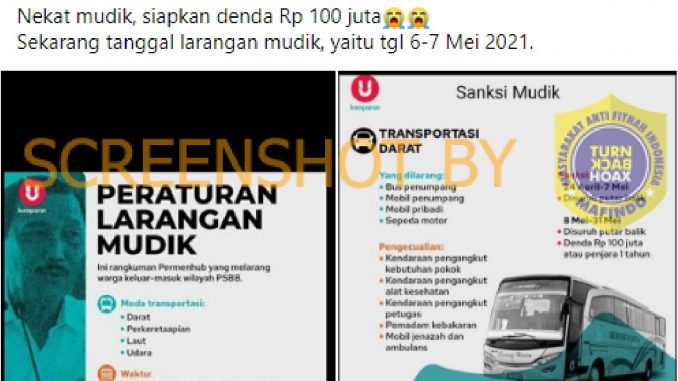 Sebuah akun Facebook bernama Uce Prasetyo mengunggah poster aturan mudik dengan menambahkan keterangan bahwa aturan denda Rp100 juta bagi pemudik pada tanggal 6-7 Mei 2021.