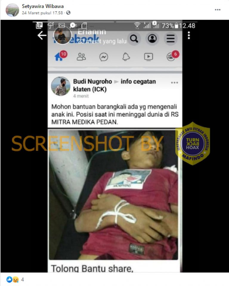 Sebuah akun Facebook bernama Setyawira Wibawa mengunggah foto seorang anak yang dikabarkan meninggal di Rumah Sakit Mitra Medika Pedan karena jatuh dari mobil tumpangannya.