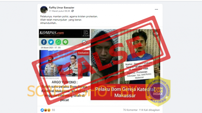 Berdasarkan hasil penelusuran, klaim adanya gambar artikel Kompas.com berjudul “Argo Yuwono: Salah satu pelaku Bom Gereja Katedral Makassar, adalah eks anggota intel yang telah di pecat” dan foto pria yang diklaim sebagai pelaku yang mantan polisi, beragama kristen protestan merupakan konten yang dimanipulasi.