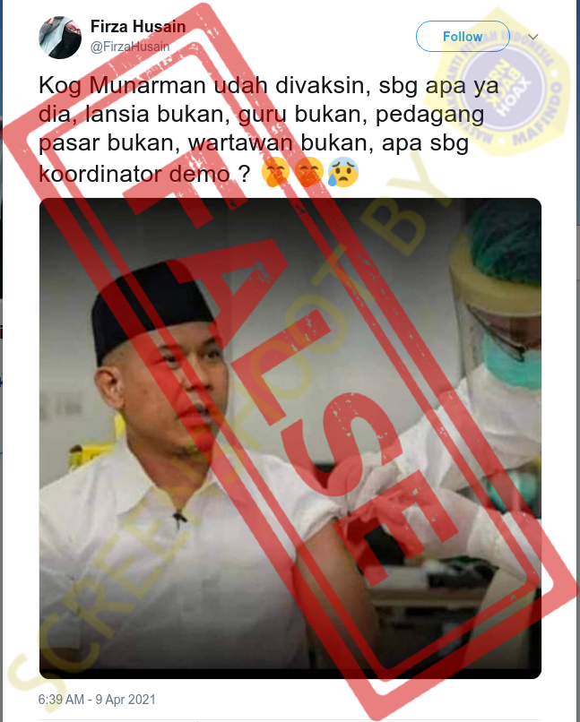 Beredar sebuah postingan pada akun twitter @FirzaHusain yang disertakan foto Munarman dengan Narasi “Kog Munarman udah divaksin, sbg apa ya dia, lansia bukan, guru bukan, pedagang pasar bukan, wartawan bukan, apa sbg koordinator demo ? 🤭🤭😰”.