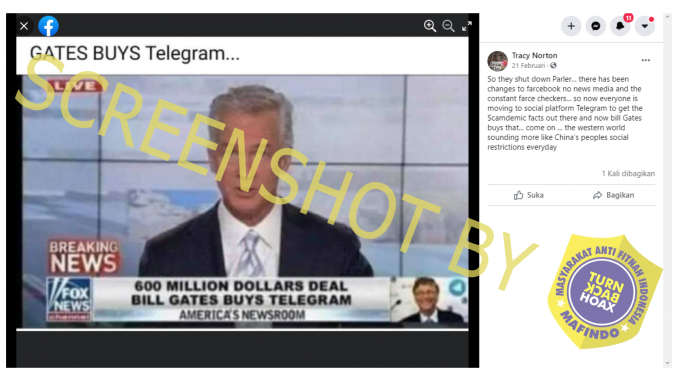 Beredar sebuah informasi di media sosial Facebook yang mengklaim bahwa pendiri Microsoft, Bill Gates, telah membeli aplikasi chat Telegram. Dalam unggahan tersebut menampilkan gambar screenshot berita Fox News yang memiliki headline “Kesepakatn 600 juta dollar (AS) Bill Gates membeli telegram”.