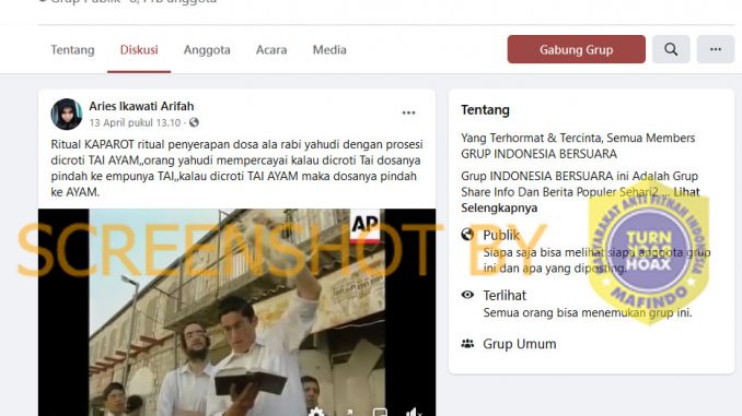 Beredar postingan di Facebook oleh akun bernama “Aries Ikawati Arifah” di grup INDONESIA BERSUARA. Dalam postingannya tersebut memperlihatkan video prosesi upacara Kaparot. Upacara Kaparot adalah tradisi ritual keagamaan umat Yahudi yang dilakukan sebelum Yom Kippur (Hari Penebusan). Postingan video dari Aries ditambahkan pula narasi bahwa upacara Yom Kippur dilakukan dengan cara menyemburkan tahi ayam, dengan penyemburan tahi ayam dipercaya dosa manusia tersebut akan berpindah ke ayam.