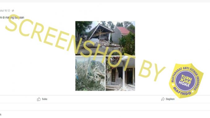 Beredar sebuah foto bangunan roboh yang diklaim sebagai akibat dari bencana alam gempa dan tsunami di Malang. Foto tersebut diunggah pada tanggal 10/04/2021 pukul 16.12 tepat setelah terjadi gempa di Malang pada pukul 14.00.