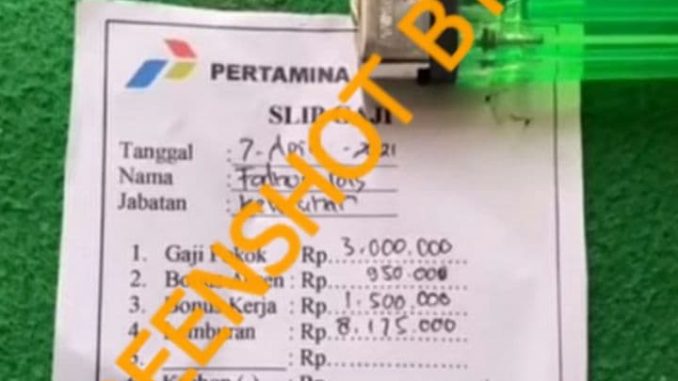 Pengguna Facebook dengan nama pengguna Ajis Bua mengunggah foto hasil tangkapan layar video TikTok yang menunjukkan slip gaji petugas kebersihan Pertamina sebesar Rp13,6 juta. Dalam unggahan tersebut, terlihat slip gaji ditulis tangan dan tertanggal 7 April 2021.