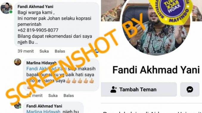 akun Facebook Bupati Gresik dengan nama pengguna Fandi Akhmad Yani ( https://www.facebook.com/fandi.a.yani.9 ). Akun tersebut menyebarkan nomor telepon koperasi pemerintah kepada warga dan meminta warga untuk menyebutkan bahwa mereka mendapat rekomendasi dari Bupati.