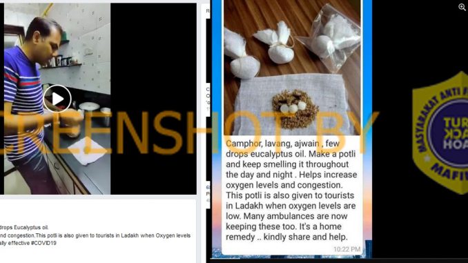 Beredar postingan di Facebook oleh akun bernama Rupa Ganguli yang menarasikan bahwa Menghirup kapus barus, cengkeh, biji karom, dan minyak kayu putih dapat meningkatkan kadar oksigen dan membantu meringankan sesak nafas. Klaim serupa juga dibagikan dalam bentuk video oleh akun bernama Deepz Theeban yang mempraktikan cara pembuatan sekaligus cara pemakaian terapi bahan kapus barus, cengkeh, biji karom, dan minyak kayu putih. Selain itu, pengobatan tersebut juga diklaim dapat meredakan gangguan pernapasan pasien COVID-19.